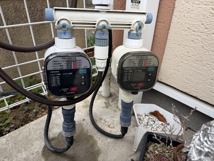左側の機械だけですが、おニューの自動潅水機に取り替えました。