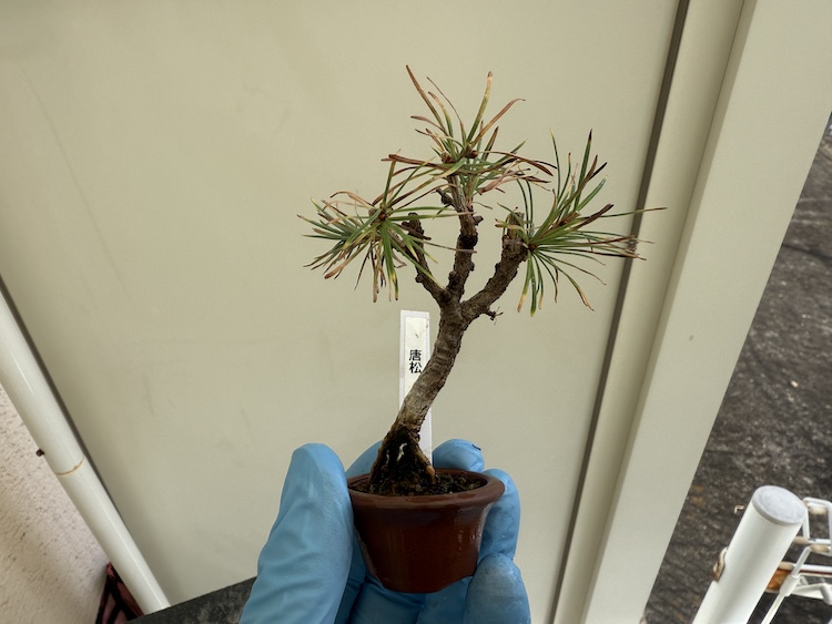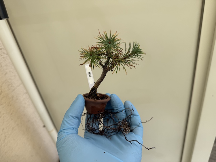 今回は展示予定の『唐松』の鉢底からはみ出た根っこの整理と