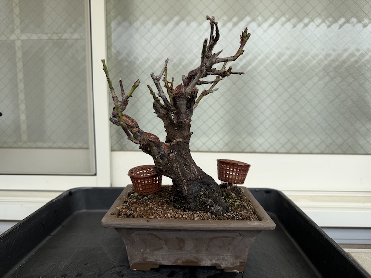 野梅『野梅』の花が萎れてしまったので、見た目を整えるのと余計な栄養を使わせないように花ガラを摘んでおきました。