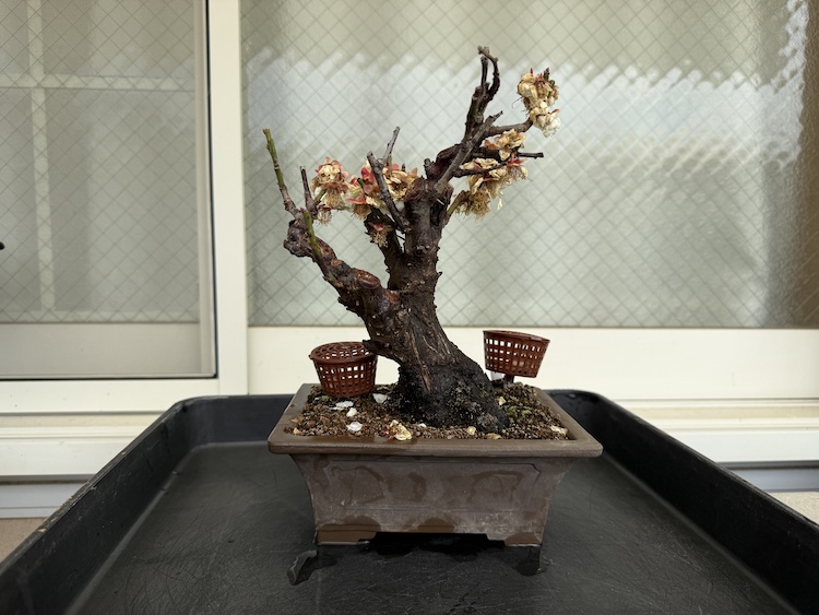 野梅『野梅』の花が萎れてしまったので、見た目を整えるのと余計な栄養を使わせないように花ガラを摘んでおきました。