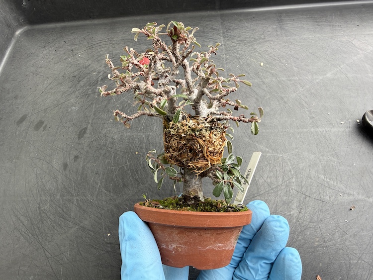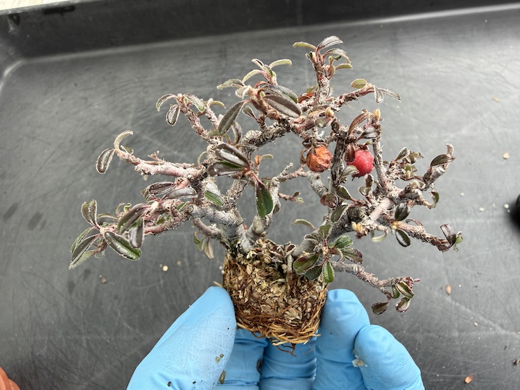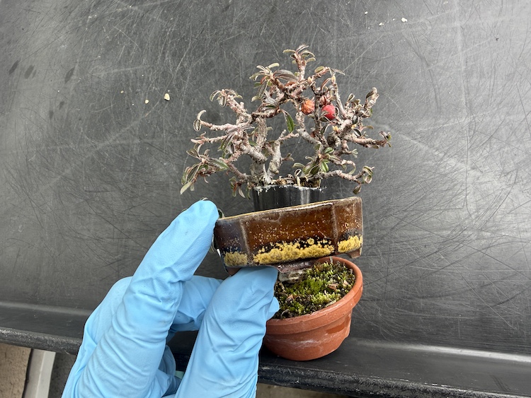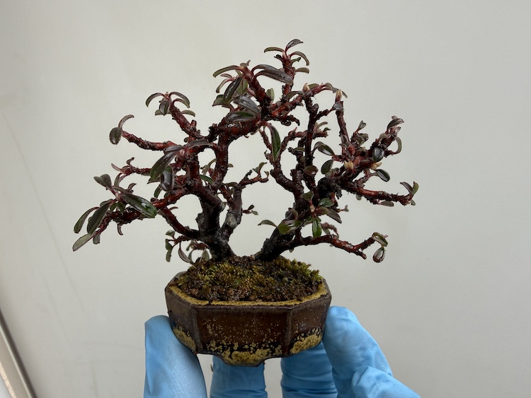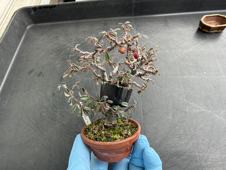 赤い実が出来るので、鉢はこれくらい渋いほうが映えそうという理由で選びました。