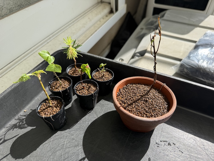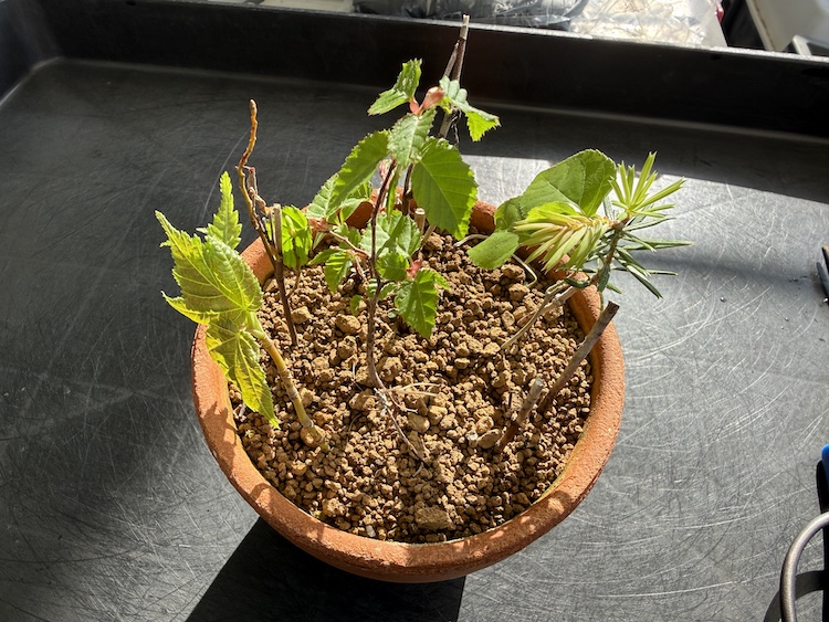実生の苗木を間に合せで寄植えにしていた素焼き鉢があったので、個別の鉢に植え替えをしておきました。