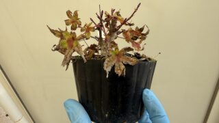 『もみじ』の品種のひとつ『出猩々』。新芽が真っ赤で綺麗な品種。今日はこの子のお手入れ。樹形を確認する為に古葉取り。枯れ枝のお掃除をしつつ、枝が混み合っている所を整理。傷口からバイキンが入らないように癒合剤を多めに塗っておきました。(本当は枝...